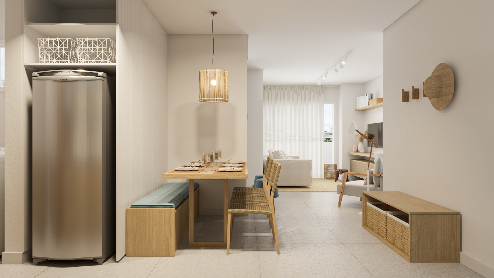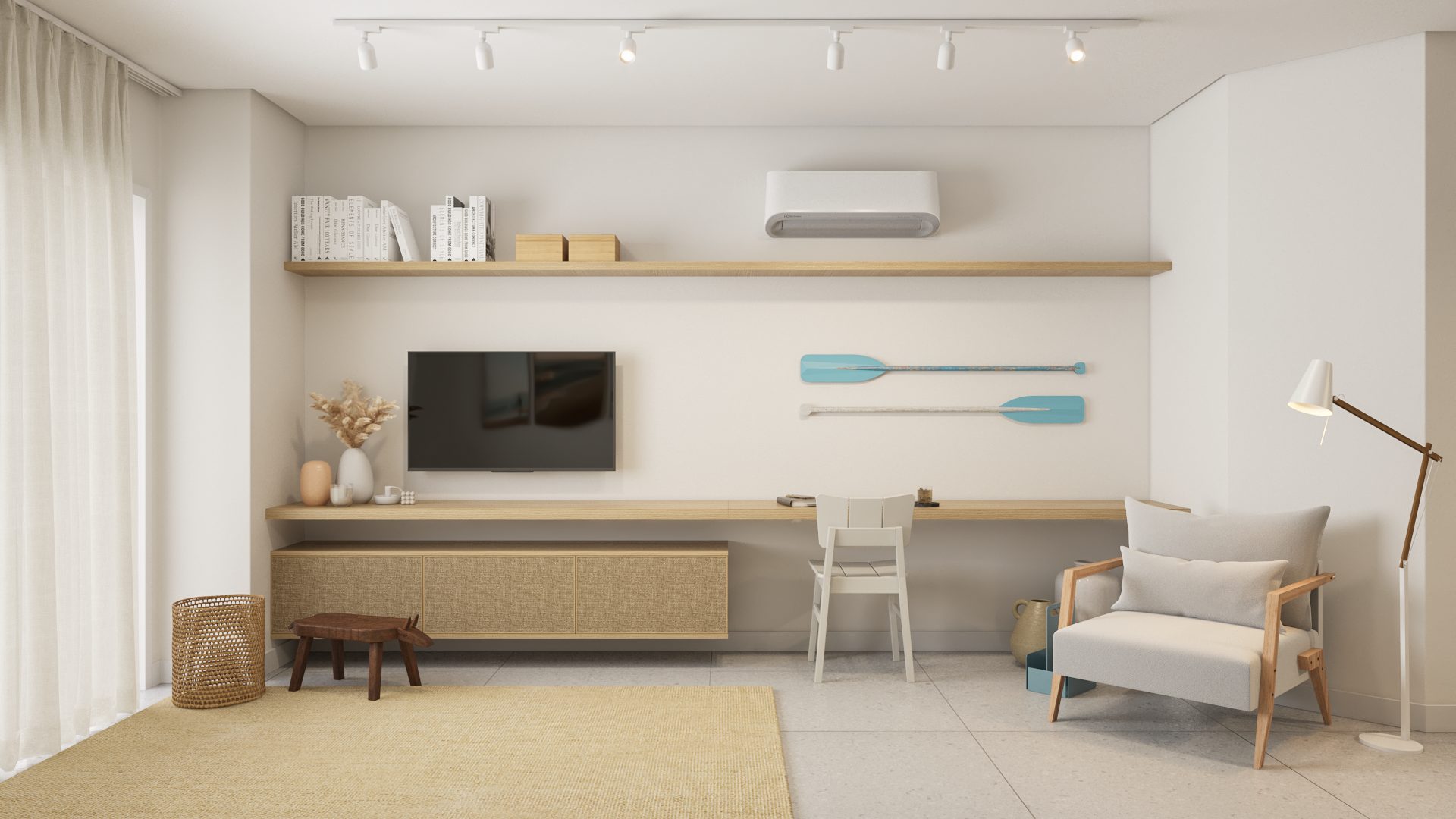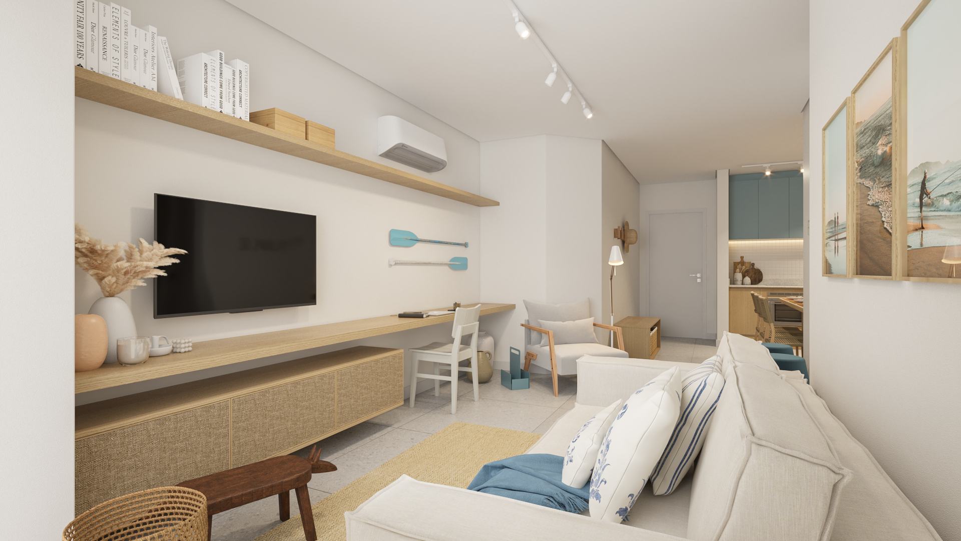 Localizado na Praia dos Ingleses, em Florianópolis, o projeto para o Apartamento Galés busca trazer a estética litorânea para o ambiente doméstico. Com o uso de cores claras, tons de azul, madeiras e fibras naturais, pretende-se a construção de espaços serenos e acolhedores.