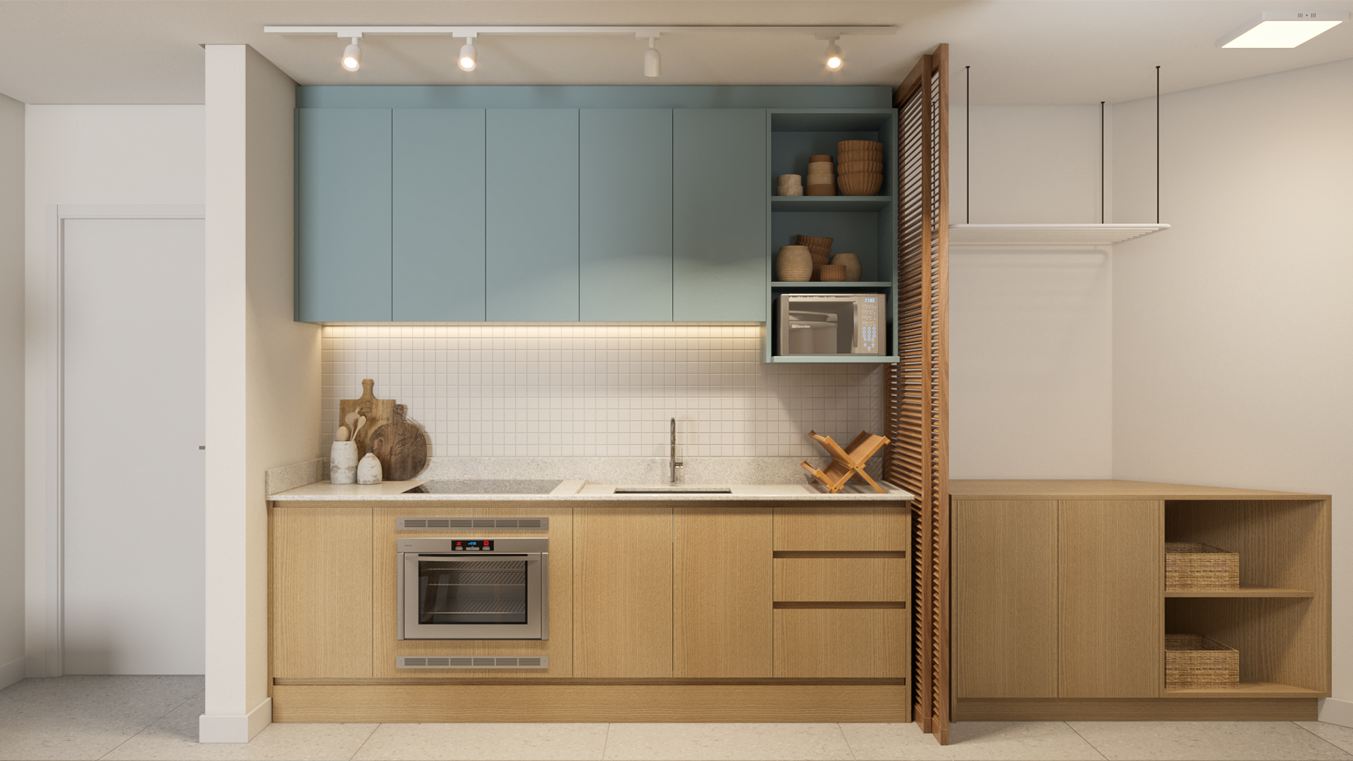 A sala é composta por uma grande bancada, ora rack ora mesa para home office, poltrona e sofá-cama. O ambiente, pensado como versátil e minimalista, visa contemplar as funções de estar e convívio, podendo, contudo, ser convertido em dormitório.