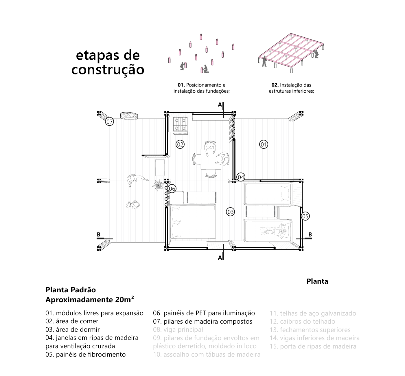 A tectônica consiste em fundações com pontaletes e quadros de madeira, sobre os quais apoiam-se pilares e vigas compostas, telhado e fechamentos. Estes, por sua vez, imaginados em modulações para as aberturas de portas e janelas e em materiais diversos, como madeira, placas de plástico reciclado e garrafas PET.